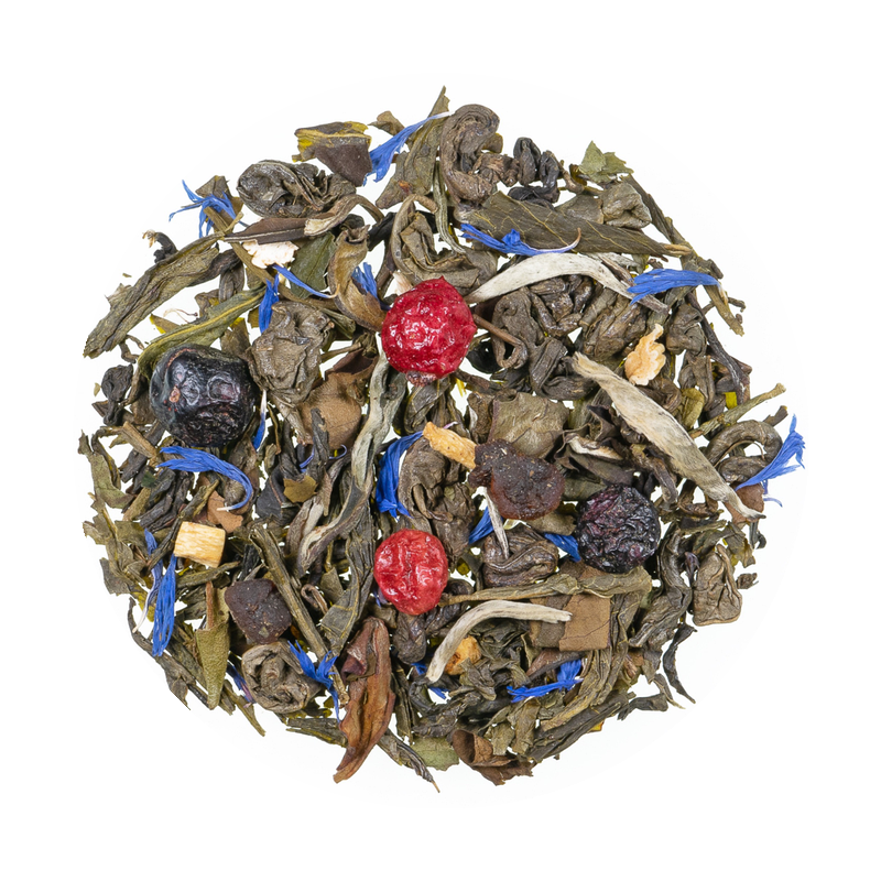 Ingredienser: Grøn te China Sencha, grøn te China Ming Mee, hvid te China Pai Mu Tan, grøn te China Gunpowder, grøn te China Wu Lu, aroma, røde og sorte ribs, ginsengrod, kornblomstblomster, abrikosstykker (abrikose, rismel) (1 %)