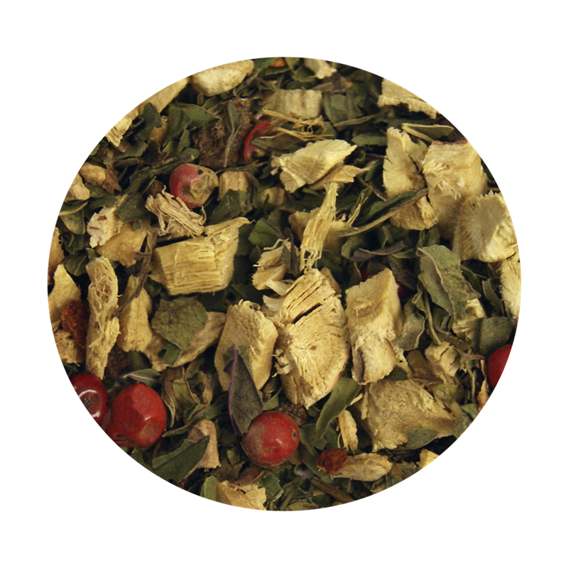 Ingredienser: Lakridsrod (50%), pebermynte (16%), ingefær (15%), kardemommekerner (10%), hel kardemomme (4%), rosa peberkorn (3%) og chili (2%)