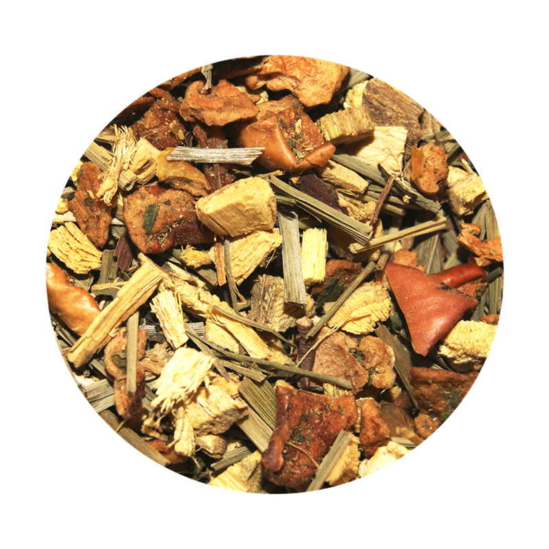 Ingredienser: Lakridsrod (34%), æblestykker (31%), citrongræs (15%), pebermynte (7%) og aroma