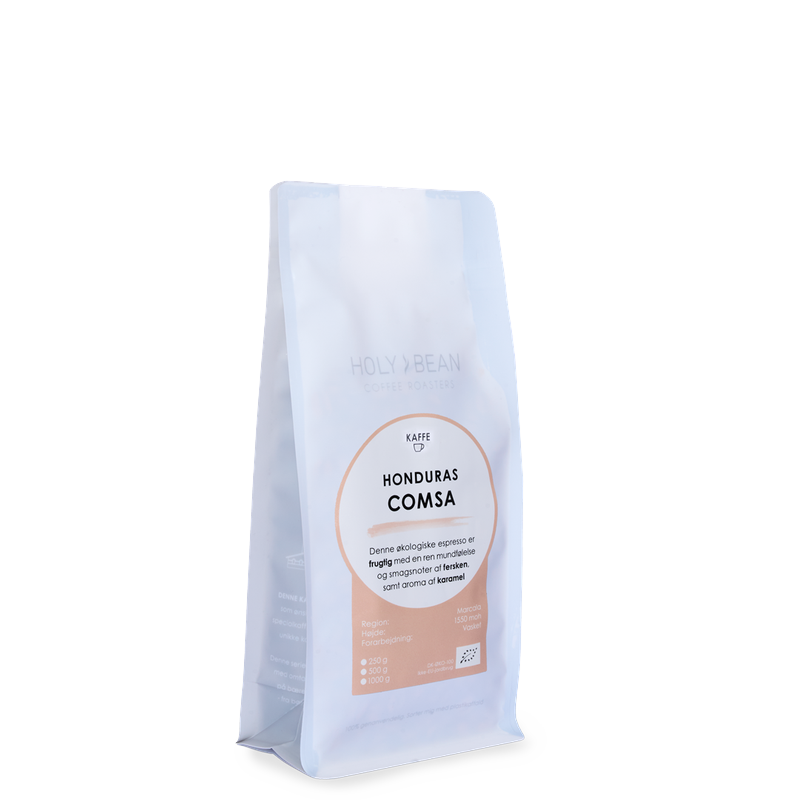 Honduras Comsa er en økologisk specialty kaffe fra kooperativet Comsa i Honduras. Kaffen er frugtig og mild med en ren og blød mundfølelse samt en flot balance mellem syrlighed og sødme. Smagsprofilen byder på noter af stenfrugt, særligt fersken, kombineret med en behagelig sødme og aroma af karamel. En harmonisk og letdrikkelig kaffe med de klassiske kendetegn for kaffe fra Honduras. Bønnerne bliver ristet i mikroristeri for at fremhæve kaffens naturlige sødme og frugtige karakter.
