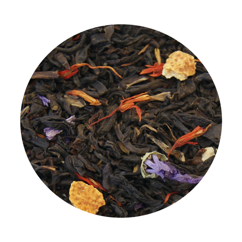 Ingredienser: Sort te (91%), orangeskaller (7%), saflorblomst (1%), katostblomster (1%) og aroma.
