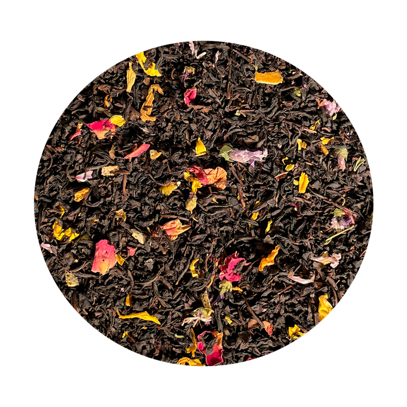 Ingredienser: Sort te(93%), orangeskaller(1,7%), aroma, solsikkeblomster, kornblomster, rosenblade