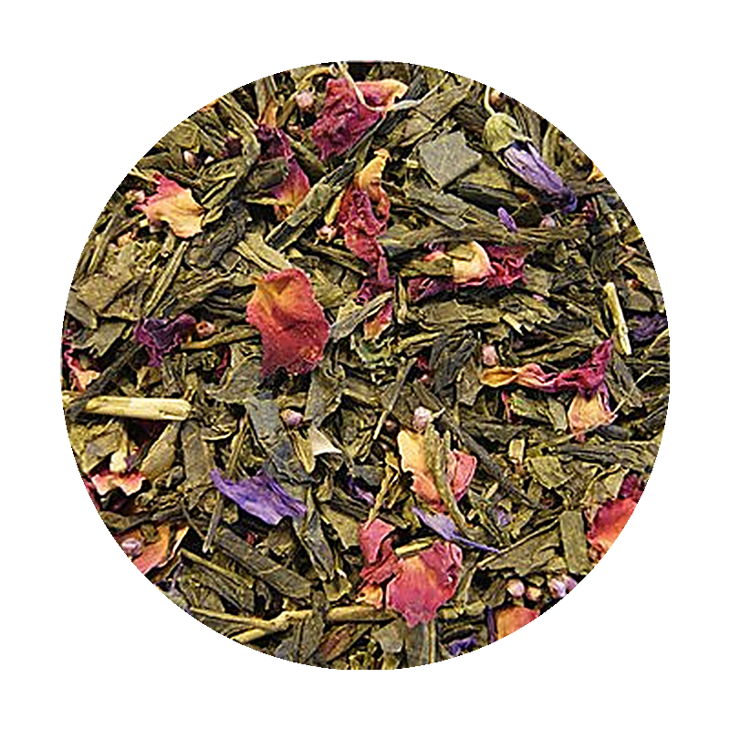 Hvid te China Mao Feng, Grøn te China Sencha, kandiserede ananasstykker (ananas, sukker), kandiserede mangostykker (mango, sukker), kirsebær, aroma, appelsinstykker, grøn te China Gunpowder, citronskal, tranebærstykker, rosenknopper, jordbærstykker, rosenblade.