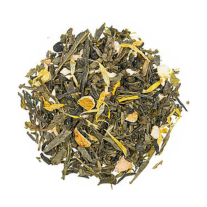 En lækker grøn te, der indeholder kandiseret ananas (ananas/sukker),  orangeskaller, naturlig aroma, kardemomme,  saflorblomster, morgenfrueblomster, rosenpeber og abrikosstykker.
