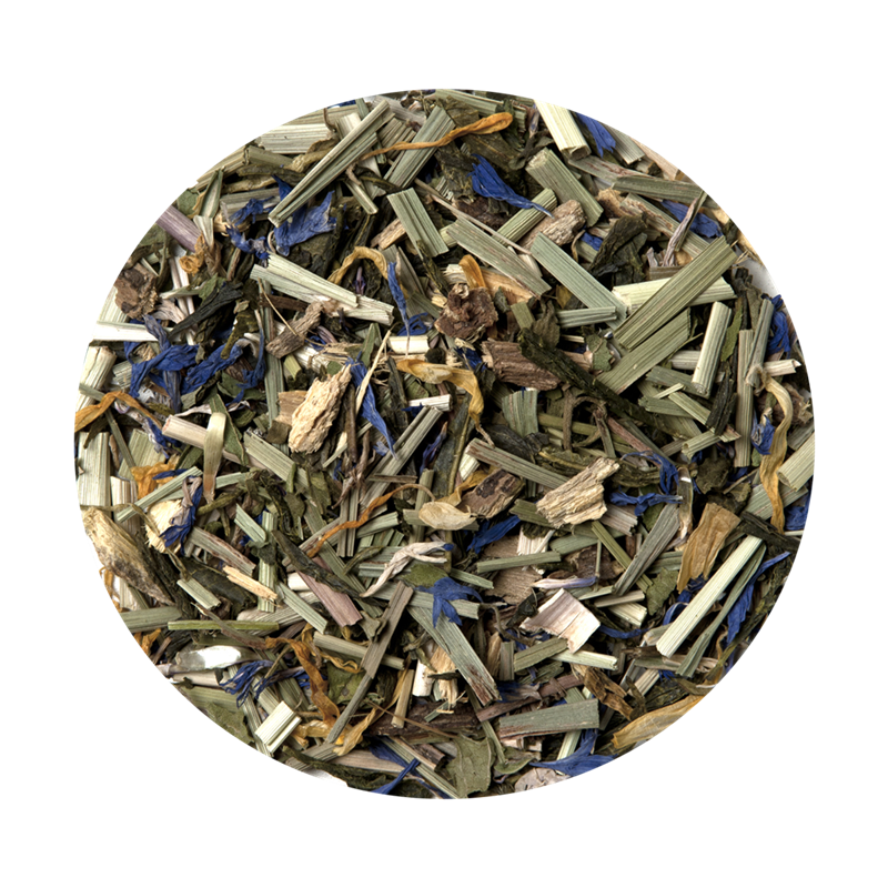 Ingredienser: Lakridsrod* (39%), grøn te* (33%), citrongræs* (23%), naturlig citron, brombær og grapefrugt aroma, kornblomst* og/eller katostblomst*, morgenfrueblomst* *=økologisk.