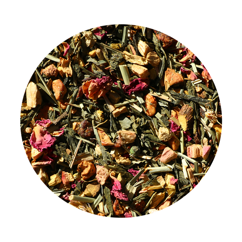 Ingredienser: Grøn sencha te (40%), skåret lakridsrod m skræl (20%), citrongræs(15%), tørrede æblestykker(15%), frysetørrede rabarberstykker(5%), aroma(3%) og rosenblade (2%)
