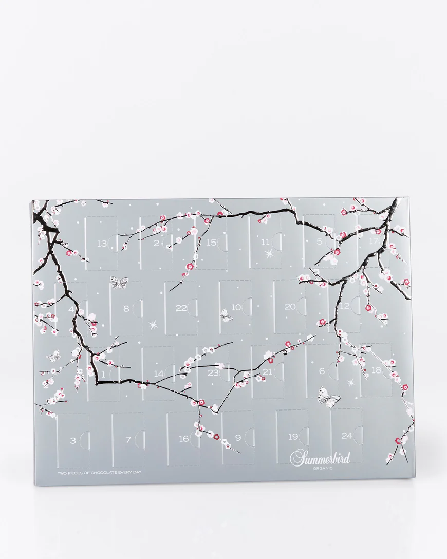 Årets klassiske julekalender med sølvmotiv er inspireret af det ikoniske tapet, som dekorerer alle vores Summerbird-Chocolaterier. Julekalenderen indeholder både vores smagfulde chokoladebarer og elegante, fyldte chokolader. Julekalenderen indeholder 12 forskellige varianter. Bag hver låge gemmer sig 2 stykker chokolade.