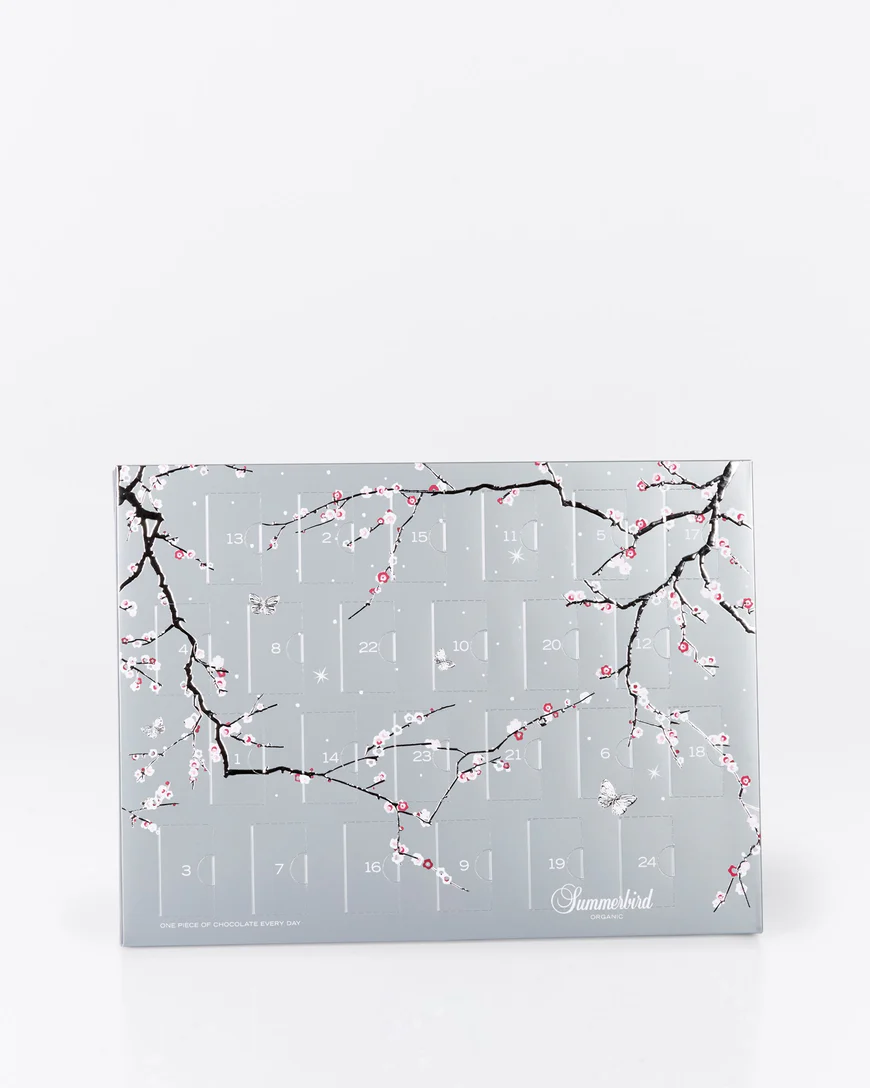 Årets klassiske julekalender med sølvmotiv er inspireret af det ikoniske tapet, som dekorerer alle vores Summerbird-Chocolaterier. Julekalenderen indeholder både vores smagfulde chokoladebarer og elegante, fyldte chokolader. Julekalenderen indeholder 12 forskellige varianter. Bag hver låge gemmer sig 1 stykke chokolade.